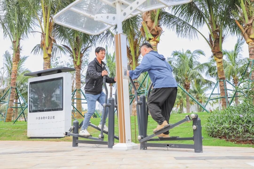 在现场,约4400平方米的空间里,草坪如茵,这里放置了共享骑行车、椭圆机等智能运动装置,还设有清凉驿站、光伏休憩廊架、休闲座椅等,如同一个“小型游乐场”,可进一步增强市民参与感,让老幼皆得其乐。